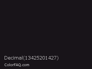 Decimal 13425201427 Color is a almost black purple color and the nearest color is Eerie Black #1b1b1b. Hex code #181419 and RGB value is rgb(24,20,25). In RGB color space, this color is composed of 9% red, 8% green, 10% blue, In CMYK color space, this color is composed of 4% cyan, 20% magenta, 0% yellow , 90% black , In HSL color space, this color has a hue angle of 288° , 11% saturation and 9% lightness.