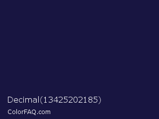 Decimal 13425202185 Color is a very dark indigo color and the nearest color is Haiti #1b1035. Hex code #181541 and RGB value is rgb(24,21,65). In RGB color space, this color is composed of 9% red, 8% green, 25% blue, In CMYK color space, this color is composed of 63% cyan, 68% magenta, 0% yellow , 75% black , In HSL color space, this color has a hue angle of 244° , 51% saturation and 17% lightness.