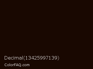 Decimal 13425997139 Color is a almost black orange color and the nearest color is Nero #140600. Hex code #190801 and RGB value is rgb(25,8,1). In RGB color space, this color is composed of 10% red, 3% green, 0% blue, In CMYK color space, this color is composed of 0% cyan, 68% magenta, 96% yellow , 90% black , In HSL color space, this color has a hue angle of 18° , 92% saturation and 5% lightness.