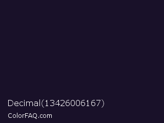 Decimal 13426006167 Color is a very dark indigo color and the nearest color is Mirage #161928. Hex code #191129 and RGB value is rgb(25,17,41). In RGB color space, this color is composed of 10% red, 7% green, 16% blue, In CMYK color space, this color is composed of 39% cyan, 59% magenta, 0% yellow , 84% black , In HSL color space, this color has a hue angle of 260° , 41% saturation and 11% lightness.