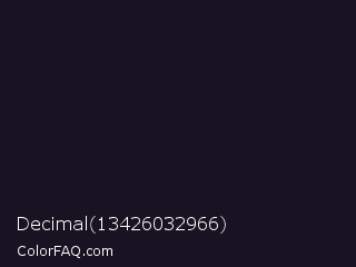 Decimal 13426032966 Color is a very dark violet color and the nearest color is Mirage #161928. Hex code #191222 and RGB value is rgb(25,18,34). In RGB color space, this color is composed of 10% red, 7% green, 13% blue, In CMYK color space, this color is composed of 26% cyan, 47% magenta, 0% yellow , 87% black , In HSL color space, this color has a hue angle of 266° , 31% saturation and 10% lightness.