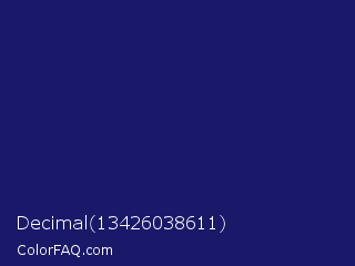 Decimal 13426038611 Color is a dark indigo color and the nearest color is Lucky Point #1a1a68. Hex code #191869 and RGB value is rgb(25,24,105). In RGB color space, this color is composed of 10% red, 9% green, 41% blue, In CMYK color space, this color is composed of 76% cyan, 77% magenta, 0% yellow , 59% black , In HSL color space, this color has a hue angle of 241° , 63% saturation and 25% lightness.