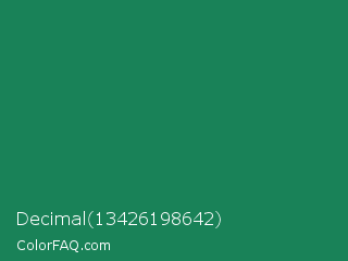 Decimal 13426198642 Color is a dark green color and the nearest color is Deep Green Cyan Turquoise #0e7c61. Hex code #198258 and RGB value is rgb(25,130,88). In RGB color space, this color is composed of 10% red, 51% green, 35% blue, In CMYK color space, this color is composed of 81% cyan, 0% magenta, 32% yellow , 49% black , In HSL color space, this color has a hue angle of 156° , 68% saturation and 30% lightness.