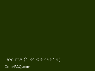 Decimal 13430649619 Color is a very dark green color and the nearest color is Deep Forest Green #182d09. Hex code #203301 and RGB value is rgb(32,51,1). In RGB color space, this color is composed of 13% red, 20% green, 0% blue, In CMYK color space, this color is composed of 37% cyan, 0% magenta, 98% yellow , 80% black , In HSL color space, this color has a hue angle of 83° , 96% saturation and 10% lightness.