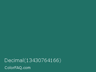 Decimal 13430764166 Color is a dark cyan color and the nearest color is Genoa #15736b. Hex code #207166 and RGB value is rgb(32,113,102). In RGB color space, this color is composed of 13% red, 44% green, 40% blue, In CMYK color space, this color is composed of 72% cyan, 0% magenta, 10% yellow , 56% black , In HSL color space, this color has a hue angle of 172° , 56% saturation and 28% lightness.