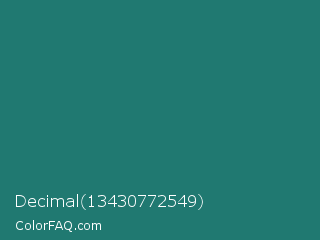 Decimal 13430772549 Color is a dark cyan color and the nearest color is Elm #1c7c7d. Hex code #207971 and RGB value is rgb(32,121,113). In RGB color space, this color is composed of 13% red, 47% green, 44% blue, In CMYK color space, this color is composed of 74% cyan, 0% magenta, 7% yellow , 53% black , In HSL color space, this color has a hue angle of 175° , 58% saturation and 30% lightness.