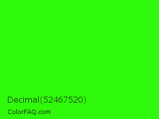 Decimal 52467520 Color is a normal green color and the nearest color is Neon Green #39ff14. Hex code #30fa0c and RGB value is rgb(48,250,12). In RGB color space, this color is composed of 19% red, 98% green, 5% blue, In CMYK color space, this color is composed of 81% cyan, 0% magenta, 95% yellow , 2% black , In HSL color space, this color has a hue angle of 111° , 96% saturation and 51% lightness.