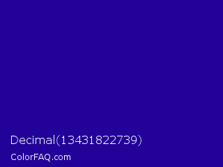 Decimal 13431822739 Color is a dark indigo color and the nearest color is Blue Gem #2c0e8c. Hex code #220299 and RGB value is rgb(34,2,153). In RGB color space, this color is composed of 13% red, 1% green, 60% blue, In CMYK color space, this color is composed of 78% cyan, 99% magenta, 0% yellow , 40% black , In HSL color space, this color has a hue angle of 253° , 97% saturation and 30% lightness.