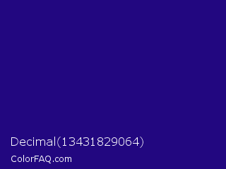 Decimal 13431829064 Color is a dark indigo color and the nearest color is Deep Blue #220878. Hex code #220780 and RGB value is rgb(34,7,128). In RGB color space, this color is composed of 13% red, 3% green, 50% blue, In CMYK color space, this color is composed of 73% cyan, 95% magenta, 0% yellow , 50% black , In HSL color space, this color has a hue angle of 253° , 90% saturation and 26% lightness.