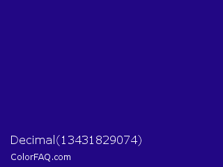 Decimal 13431829074 Color is a dark indigo color and the nearest color is Deep Blue #220878. Hex code #220784 and RGB value is rgb(34,7,132). In RGB color space, this color is composed of 13% red, 3% green, 52% blue, In CMYK color space, this color is composed of 74% cyan, 95% magenta, 0% yellow , 48% black , In HSL color space, this color has a hue angle of 253° , 90% saturation and 27% lightness.