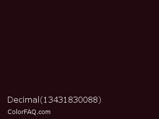 Decimal 13431830088 Color is a almost black rose color and the nearest color is Night Rider #1f120f. Hex code #220910 and RGB value is rgb(34,9,16). In RGB color space, this color is composed of 13% red, 4% green, 6% blue, In CMYK color space, this color is composed of 0% cyan, 74% magenta, 53% yellow , 87% black , In HSL color space, this color has a hue angle of 343° , 58% saturation and 8% lightness.
