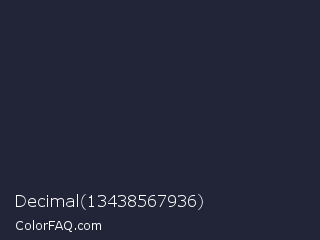 Decimal 13438567936 Color is a very dark blue color and the nearest color is Steel Gray #262335. Hex code #222438 and RGB value is rgb(34,36,56). In RGB color space, this color is composed of 13% red, 14% green, 22% blue, In CMYK color space, this color is composed of 39% cyan, 36% magenta, 0% yellow , 78% black , In HSL color space, this color has a hue angle of 235° , 24% saturation and 18% lightness.