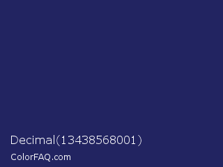 Decimal 13438568001 Color is a dark blue color and the nearest color is Lucky Point #1a1a68. Hex code #222461 and RGB value is rgb(34,36,97). In RGB color space, this color is composed of 13% red, 14% green, 38% blue, In CMYK color space, this color is composed of 65% cyan, 63% magenta, 0% yellow , 62% black , In HSL color space, this color has a hue angle of 238° , 48% saturation and 26% lightness.