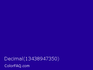 Decimal 13438947350 Color is a dark indigo color and the nearest color is Blue Gem #2c0e8c. Hex code #230098 and RGB value is rgb(35,0,152). In RGB color space, this color is composed of 14% red, 0% green, 60% blue, In CMYK color space, this color is composed of 77% cyan, 100% magenta, 0% yellow , 40% black , In HSL color space, this color has a hue angle of 254° , 100% saturation and 30% lightness.