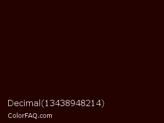Decimal 13438948214 Color is a almost black red color and the nearest color is Sepia Black #2b0202. Hex code #230200 and RGB value is rgb(35,2,0). In RGB color space, this color is composed of 14% red, 1% green, 0% blue, In CMYK color space, this color is composed of 0% cyan, 94% magenta, 100% yellow , 86% black , In HSL color space, this color has a hue angle of 3° , 100% saturation and 7% lightness.