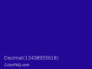 Decimal 13438955618 Color is a normal indigo color and the nearest color is Blue Gem #2c0e8c. Hex code #230896 and RGB value is rgb(35,8,150). In RGB color space, this color is composed of 14% red, 3% green, 59% blue, In CMYK color space, this color is composed of 77% cyan, 95% magenta, 0% yellow , 41% black , In HSL color space, this color has a hue angle of 251° , 90% saturation and 31% lightness.