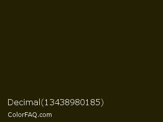 Decimal 13438980185 Color is a almost black yellow color and the nearest color is Cannon Black #251706. Hex code #232003 and RGB value is rgb(35,32,3). In RGB color space, this color is composed of 14% red, 13% green, 1% blue, In CMYK color space, this color is composed of 0% cyan, 9% magenta, 91% yellow , 86% black , In HSL color space, this color has a hue angle of 54° , 84% saturation and 7% lightness.