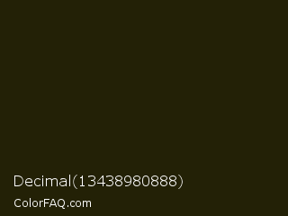 Decimal 13438980888 Color is a almost black yellow color and the nearest color is Cannon Black #251706. Hex code #232106 and RGB value is rgb(35,33,6). In RGB color space, this color is composed of 14% red, 13% green, 2% blue, In CMYK color space, this color is composed of 0% cyan, 6% magenta, 83% yellow , 86% black , In HSL color space, this color has a hue angle of 56° , 71% saturation and 8% lightness.