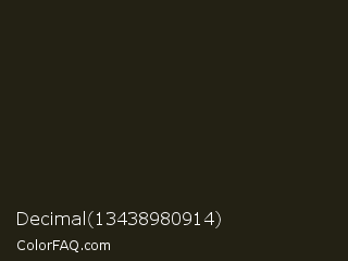 Decimal 13438980914 Color is a very dark yellow color and the nearest color is Oil #281e15. Hex code #232114 and RGB value is rgb(35,33,20). In RGB color space, this color is composed of 14% red, 13% green, 8% blue, In CMYK color space, this color is composed of 0% cyan, 6% magenta, 43% yellow , 86% black , In HSL color space, this color has a hue angle of 52° , 27% saturation and 11% lightness.
