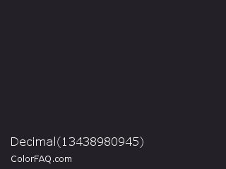 Decimal 13438980945 Color is a very dark indigo color and the nearest color is Raisin Black #242124. Hex code #232127 and RGB value is rgb(35,33,39). In RGB color space, this color is composed of 14% red, 13% green, 15% blue, In CMYK color space, this color is composed of 10% cyan, 15% magenta, 0% yellow , 85% black , In HSL color space, this color has a hue angle of 260° , 8% saturation and 14% lightness.