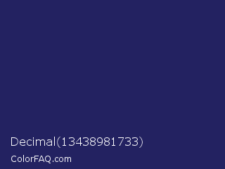 Decimal 13438981733 Color is a dark indigo color and the nearest color is Lucky Point #1a1a68. Hex code #232261 and RGB value is rgb(35,34,97). In RGB color space, this color is composed of 14% red, 13% green, 38% blue, In CMYK color space, this color is composed of 64% cyan, 65% magenta, 0% yellow , 62% black , In HSL color space, this color has a hue angle of 241° , 48% saturation and 26% lightness.