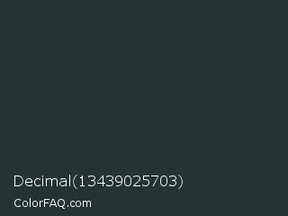 Decimal 13439025703 Color is a very dark cyan color and the nearest color is Gunmetal #2a3439. Hex code #233433 and RGB value is rgb(35,52,51). In RGB color space, this color is composed of 14% red, 20% green, 20% blue, In CMYK color space, this color is composed of 33% cyan, 0% magenta, 2% yellow , 80% black , In HSL color space, this color has a hue angle of 176° , 20% saturation and 17% lightness.