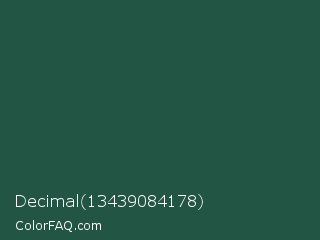 Decimal 13439084178 Color is a dark green color and the nearest color is Plantation #27504b. Hex code #235544 and RGB value is rgb(35,85,68). In RGB color space, this color is composed of 14% red, 33% green, 27% blue, In CMYK color space, this color is composed of 59% cyan, 0% magenta, 20% yellow , 67% black , In HSL color space, this color has a hue angle of 160° , 42% saturation and 24% lightness.