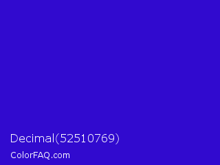 Decimal 52510769 Color is a normal indigo color and the nearest color is Interdimensional Blue #360ccc. Hex code #310acf and RGB value is rgb(49,10,207). In RGB color space, this color is composed of 19% red, 4% green, 81% blue, In CMYK color space, this color is composed of 76% cyan, 95% magenta, 0% yellow , 19% black , In HSL color space, this color has a hue angle of 252° , 91% saturation and 43% lightness.