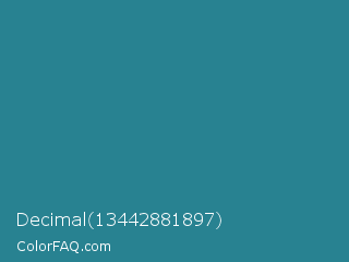 Decimal 13442881897 Color is a normal cyan color and the nearest color is Jelly Bean #297b9a. Hex code #288291 and RGB value is rgb(40,130,145). In RGB color space, this color is composed of 16% red, 51% green, 57% blue, In CMYK color space, this color is composed of 72% cyan, 10% magenta, 0% yellow , 43% black , In HSL color space, this color has a hue angle of 189° , 57% saturation and 36% lightness.