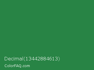 Decimal 13442884613 Color is a normal green color and the nearest color is Sea Green #2e8b57. Hex code #288445 and RGB value is rgb(40,132,69). In RGB color space, this color is composed of 16% red, 52% green, 27% blue, In CMYK color space, this color is composed of 70% cyan, 0% magenta, 48% yellow , 48% black , In HSL color space, this color has a hue angle of 139° , 53% saturation and 34% lightness.