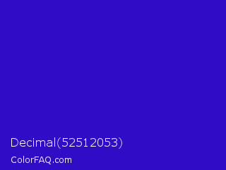 Decimal 52512053 Color is a normal indigo color and the nearest color is Interdimensional Blue #360ccc. Hex code #310cc7 and RGB value is rgb(49,12,199). In RGB color space, this color is composed of 19% red, 5% green, 78% blue, In CMYK color space, this color is composed of 75% cyan, 94% magenta, 0% yellow , 22% black , In HSL color space, this color has a hue angle of 252° , 89% saturation and 41% lightness.