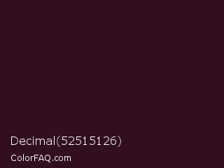 Decimal 52515126 Color is a very dark rose color and the nearest color is Tamarind #341515. Hex code #310f20 and RGB value is rgb(49,15,32). In RGB color space, this color is composed of 19% red, 6% green, 13% blue, In CMYK color space, this color is composed of 0% cyan, 69% magenta, 35% yellow , 81% black , In HSL color space, this color has a hue angle of 330° , 53% saturation and 13% lightness.