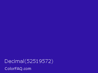 Decimal 52519572 Color is a normal indigo color and the nearest color is Blue Gem #2c0e8c. Hex code #3113a6 and RGB value is rgb(49,19,166). In RGB color space, this color is composed of 19% red, 7% green, 65% blue, In CMYK color space, this color is composed of 70% cyan, 89% magenta, 0% yellow , 35% black , In HSL color space, this color has a hue angle of 252° , 79% saturation and 36% lightness.