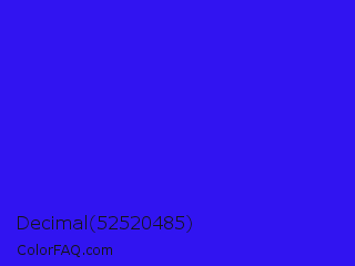 Decimal 52520485 Color is a normal indigo color and the nearest color is Bluebonnet #1c1cf0. Hex code #3114f1 and RGB value is rgb(49,20,241). In RGB color space, this color is composed of 19% red, 8% green, 95% blue, In CMYK color space, this color is composed of 80% cyan, 92% magenta, 0% yellow , 5% black , In HSL color space, this color has a hue angle of 248° , 89% saturation and 51% lightness.