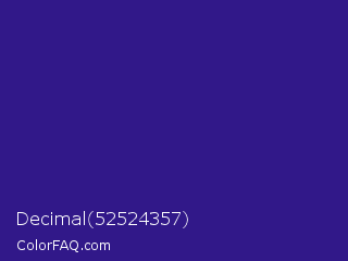 Decimal 52524357 Color is a normal indigo color and the nearest color is Pixie Powder #391285. Hex code #311889 and RGB value is rgb(49,24,137). In RGB color space, this color is composed of 19% red, 9% green, 54% blue, In CMYK color space, this color is composed of 64% cyan, 82% magenta, 0% yellow , 46% black , In HSL color space, this color has a hue angle of 253° , 70% saturation and 32% lightness.