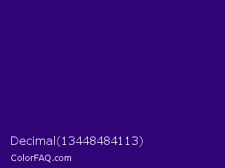 Decimal 13448484113 Color is a dark violet color and the nearest color is Blue Diamond #380474. Hex code #310477 and RGB value is rgb(49,4,119). In RGB color space, this color is composed of 19% red, 2% green, 47% blue, In CMYK color space, this color is composed of 59% cyan, 97% magenta, 0% yellow , 53% black , In HSL color space, this color has a hue angle of 263° , 93% saturation and 24% lightness.