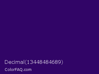 Decimal 13448484689 Color is a very dark violet color and the nearest color is Christalle #33036b. Hex code #310567 and RGB value is rgb(49,5,103). In RGB color space, this color is composed of 19% red, 2% green, 40% blue, In CMYK color space, this color is composed of 52% cyan, 95% magenta, 0% yellow , 60% black , In HSL color space, this color has a hue angle of 267° , 91% saturation and 21% lightness.