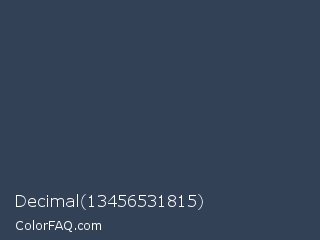 Decimal 13456531815 Color is a dark blue color and the nearest color is Pickled Bluewood #314459. Hex code #334157 and RGB value is rgb(51,65,87). In RGB color space, this color is composed of 20% red, 25% green, 34% blue, In CMYK color space, this color is composed of 41% cyan, 25% magenta, 0% yellow , 66% black , In HSL color space, this color has a hue angle of 217° , 26% saturation and 27% lightness.