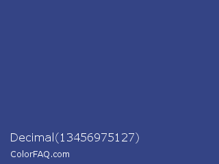 Decimal 13456975127 Color is a normal blue color and the nearest color is Chambray #354e8c. Hex code #344485 and RGB value is rgb(52,68,133). In RGB color space, this color is composed of 20% red, 27% green, 52% blue, In CMYK color space, this color is composed of 61% cyan, 49% magenta, 0% yellow , 48% black , In HSL color space, this color has a hue angle of 228° , 44% saturation and 36% lightness.