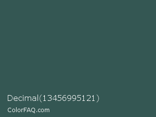 Decimal 13456995121 Color is a dark cyan color and the nearest color is Stromboli #325d52. Hex code #345753 and RGB value is rgb(52,87,83). In RGB color space, this color is composed of 20% red, 34% green, 33% blue, In CMYK color space, this color is composed of 40% cyan, 0% magenta, 5% yellow , 66% black , In HSL color space, this color has a hue angle of 173° , 25% saturation and 27% lightness.