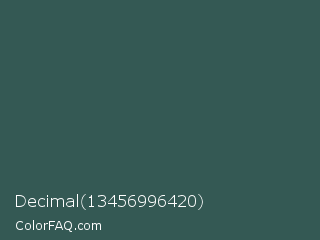 Decimal 13456996420 Color is a dark cyan color and the nearest color is Stromboli #325d52. Hex code #345954 and RGB value is rgb(52,89,84). In RGB color space, this color is composed of 20% red, 35% green, 33% blue, In CMYK color space, this color is composed of 42% cyan, 0% magenta, 6% yellow , 65% black , In HSL color space, this color has a hue angle of 172° , 26% saturation and 28% lightness.