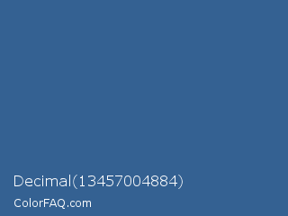 Decimal 13457004884 Color is a normal blue color and the nearest color is B Dazzled Blue #2e5894. Hex code #346192 and RGB value is rgb(52,97,146). In RGB color space, this color is composed of 20% red, 38% green, 57% blue, In CMYK color space, this color is composed of 64% cyan, 34% magenta, 0% yellow , 43% black , In HSL color space, this color has a hue angle of 211° , 47% saturation and 39% lightness.