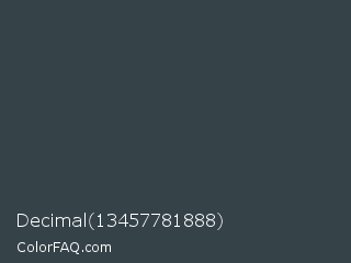 Decimal 13457781888 Color is a dark blue color and the nearest color is Arsenic #3b444b. Hex code #354248 and RGB value is rgb(53,66,72). In RGB color space, this color is composed of 21% red, 26% green, 28% blue, In CMYK color space, this color is composed of 26% cyan, 8% magenta, 0% yellow , 72% black , In HSL color space, this color has a hue angle of 199° , 15% saturation and 25% lightness.