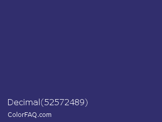 Decimal 52572489 Color is a dark indigo color and the nearest color is Deep Koamaru #333366. Hex code #312e6d and RGB value is rgb(49,46,109). In RGB color space, this color is composed of 19% red, 18% green, 43% blue, In CMYK color space, this color is composed of 55% cyan, 58% magenta, 0% yellow , 57% black , In HSL color space, this color has a hue angle of 243° , 41% saturation and 30% lightness.