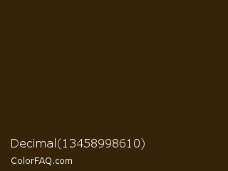 Decimal 13458998610 Color is a very dark orange color and the nearest color is Clinker #371d09. Hex code #372308 and RGB value is rgb(55,35,8). In RGB color space, this color is composed of 22% red, 14% green, 3% blue, In CMYK color space, this color is composed of 0% cyan, 36% magenta, 85% yellow , 78% black , In HSL color space, this color has a hue angle of 34° , 75% saturation and 12% lightness.