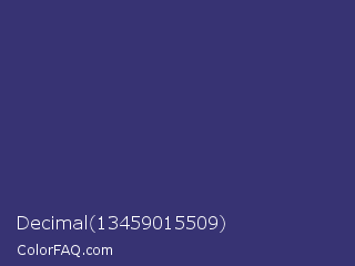 Decimal 13459015509 Color is a normal indigo color and the nearest color is Jacarta #3a2a6a. Hex code #373373 and RGB value is rgb(55,51,115). In RGB color space, this color is composed of 22% red, 20% green, 45% blue, In CMYK color space, this color is composed of 52% cyan, 56% magenta, 0% yellow , 55% black , In HSL color space, this color has a hue angle of 244° , 39% saturation and 33% lightness.