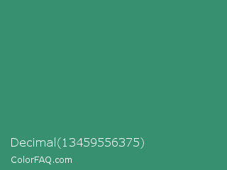 Decimal 13459556375 Color is a normal green color and the nearest color is Illuminating Emerald #319177. Hex code #379171 and RGB value is rgb(55,145,113). In RGB color space, this color is composed of 22% red, 57% green, 44% blue, In CMYK color space, this color is composed of 62% cyan, 0% magenta, 22% yellow , 43% black , In HSL color space, this color has a hue angle of 159° , 45% saturation and 39% lightness.