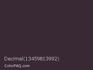 Decimal 13459813992 Color is a very dark magenta color and the nearest color is Thunder #33292f. Hex code #382934 and RGB value is rgb(56,41,52). In RGB color space, this color is composed of 22% red, 16% green, 20% blue, In CMYK color space, this color is composed of 0% cyan, 27% magenta, 7% yellow , 78% black , In HSL color space, this color has a hue angle of 316° , 15% saturation and 19% lightness.