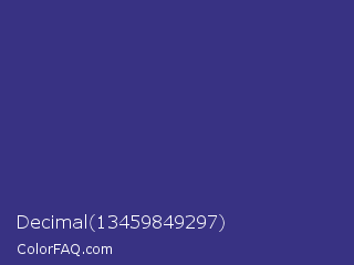 Decimal 13459849297 Color is a normal indigo color and the nearest color is Minsk #3f307f. Hex code #383283 and RGB value is rgb(56,50,131). In RGB color space, this color is composed of 22% red, 20% green, 51% blue, In CMYK color space, this color is composed of 57% cyan, 62% magenta, 0% yellow , 49% black , In HSL color space, this color has a hue angle of 244° , 45% saturation and 35% lightness.