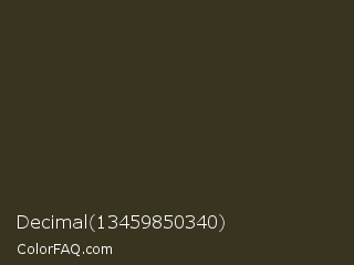 Decimal 13459850340 Color is a very dark yellow color and the nearest color is Olive Drab 7 #3c341f. Hex code #383420 and RGB value is rgb(56,52,32). In RGB color space, this color is composed of 22% red, 20% green, 13% blue, In CMYK color space, this color is composed of 0% cyan, 7% magenta, 43% yellow , 78% black , In HSL color space, this color has a hue angle of 50° , 27% saturation and 17% lightness.